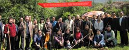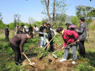福建省僑聯(lián)副主席楊崢嶸、謝小建、福州市人大副主任陳樹雄、市政協(xié)副主席陳震宙、福州市僑聯(lián)黨組書記、主席藍(lán)桂蘭、福州市僑聯(lián)副主席、鼓樓區(qū)僑聯(lián)主席李盛玉、永泰縣僑聯(lián)黨支部書記汪秀錦等領(lǐng)導(dǎo)與青年委員和僑聯(lián)機(jī)關(guān)干部共同栽下近百株的桃樹和桂花樹,并細(xì)心地為每棵樹苗系上簽有自己名字的綠葉圖形標(biāo)識,寓意僑聯(lián)事業(yè)與樹苗一同成長壯大、煥發(fā)生機(jī)活力。