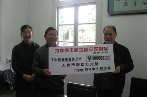 中新網(wǎng)4月20日電 據(jù)瑞安市僑聯(lián)消息,青海玉樹縣的地震震撼了每個(gè)中國人,也揪緊了千里之外瑞安僑胞的心。4月19日凌晨5時(shí)多,浙江省瑞安市寧益鄉(xiāng)僑聯(lián)主席吳勝運(yùn)接到瑞安籍捷克僑領(lǐng)程志駭?shù)碾娫挘f自己有一筆10萬元的玉樹賑災(zāi)捐款將由他的岳父葉余積轉(zhuǎn)交給瑞安市僑聯(lián)。