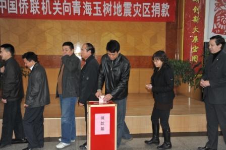 中國(guó)僑聯(lián)副主席李祖沛現(xiàn)場(chǎng)傳達(dá)了中共中央政治局委員、全國(guó)人大常委會(huì)副委員長(zhǎng)王兆國(guó)對(duì)僑聯(lián)開(kāi)展玉樹(shù)抗震救災(zāi)的指示精神和林軍對(duì)玉樹(shù)抗震救災(zāi)的批示精神,指出要把廣大歸僑僑眷和海外僑胞支援抗震救災(zāi)的熱情引導(dǎo)并融入黨政主導(dǎo)的抗震救災(zāi)行動(dòng)中去,并號(hào)召機(jī)關(guān)廣大干部職工要大力發(fā)揚(yáng)“一方有難、八方支援”的精神,心系災(zāi)區(qū)、情系災(zāi)民,以實(shí)際行動(dòng)幫助災(zāi)區(qū)群眾渡過(guò)難關(guān)。隨后,舉行了中國(guó)僑聯(lián)機(jī)關(guān)向青海玉樹(shù)地震災(zāi)區(qū)捐款活動(dòng)。中國(guó)僑聯(lián)黨組書(shū)記、主席林軍、副主席李祖沛、董中原、王永樂(lè)帶頭向?yàn)?zāi)區(qū)捐款,出差在外的副主席喬衛(wèi)也委托他人捐款。
