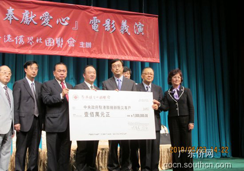 中新網(wǎng)5月6日電 據(jù)廣東僑網(wǎng)消息,5月3日,香港僑界社團(tuán)聯(lián)會(huì)舉行“情系玉樹 奉獻(xiàn)愛心 電影義演”暨向玉樹地震災(zāi)區(qū)捐款儀式,廣東省僑辦主任吳銳成應(yīng)邀出席并講話。
