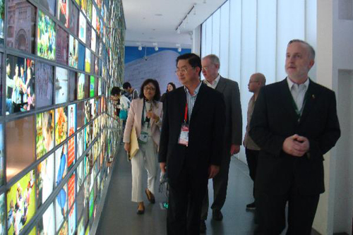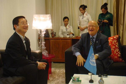 在聯(lián)合國館項目服務商、美國全美蘇浙同鄉(xiāng)總會會長朱元忠的陪同下,崔明華一行又參觀了上海世博會聯(lián)合國館,并體驗了在聯(lián)合國館內(nèi)舉行的中國茶藝表演,并于聯(lián)合國副秘書長阿瓦尼·貝南進行了親切的會談。崔明華最后也在留言薄上題詞:“和諧之理念,發(fā)展之動力!
